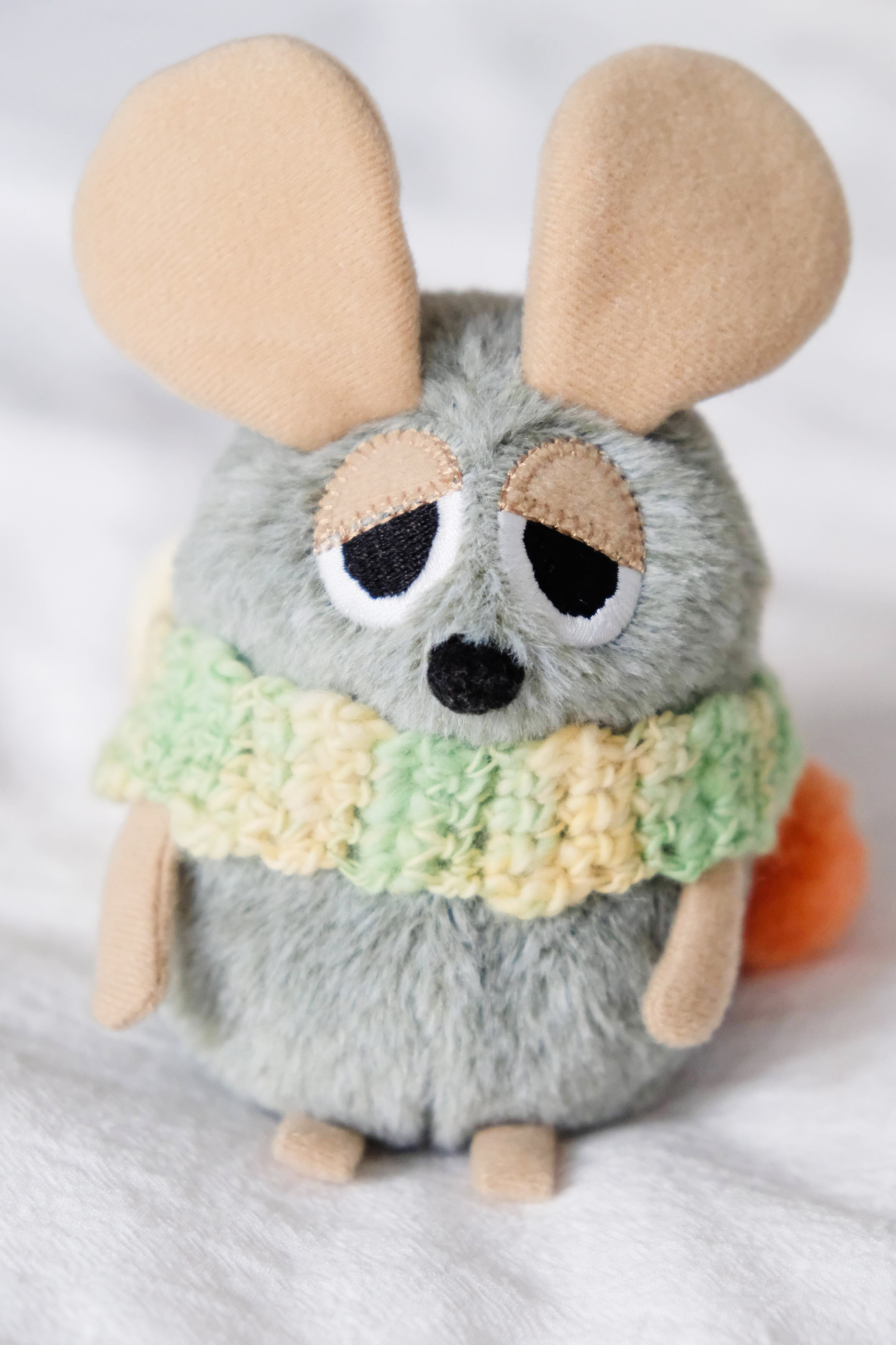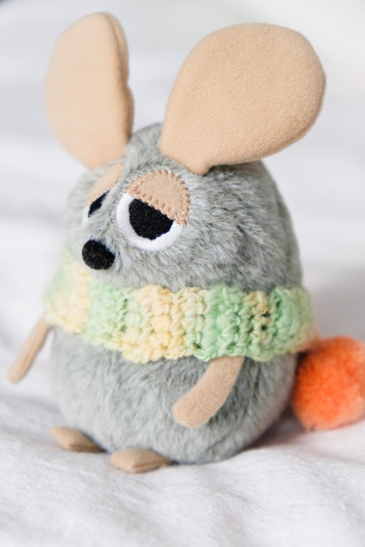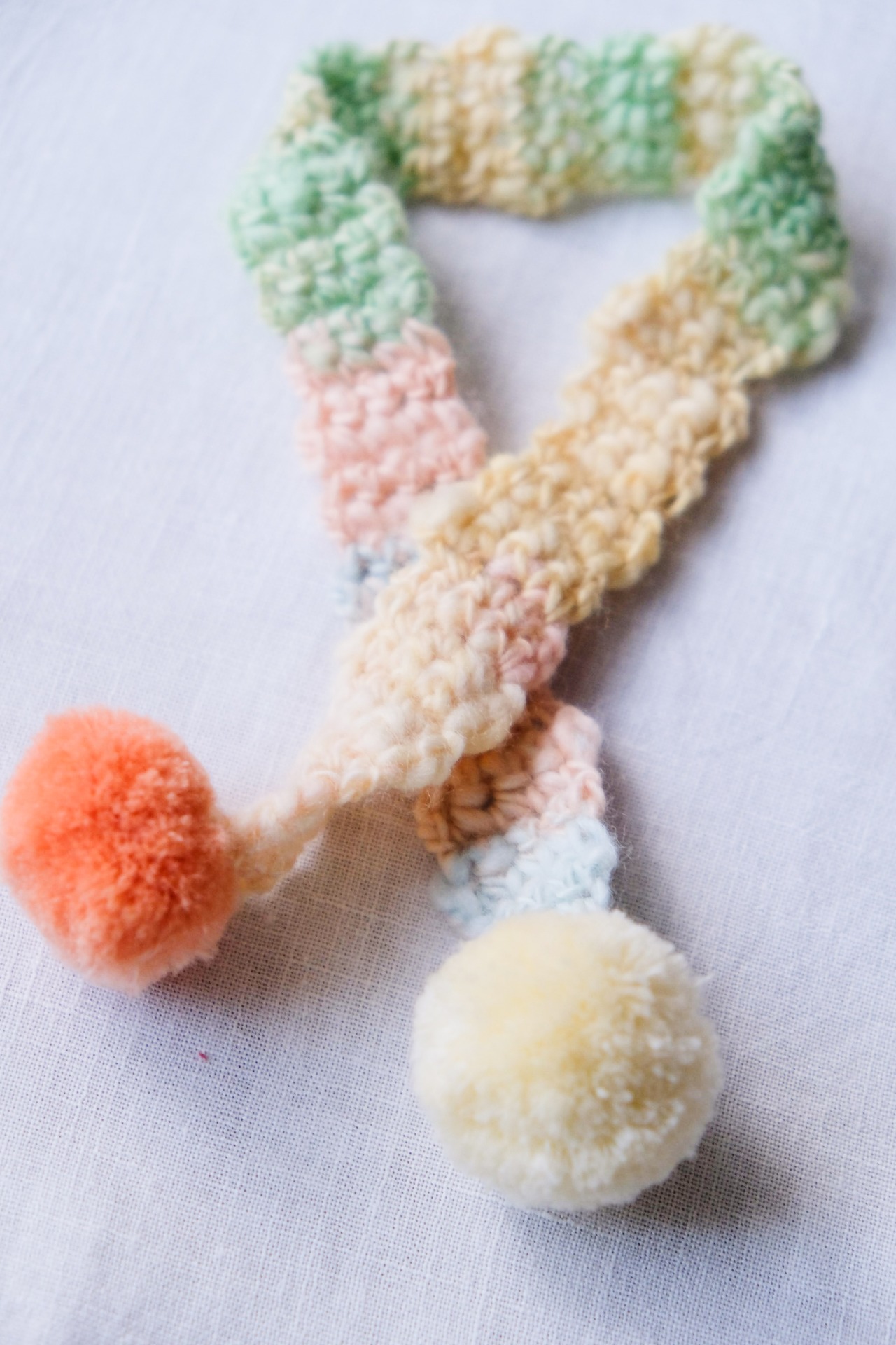 オリジナルで糸を作っている作家さんから購入したふわふわな糸で編んだ、ぬいぐるみさんのためのマフラーです。