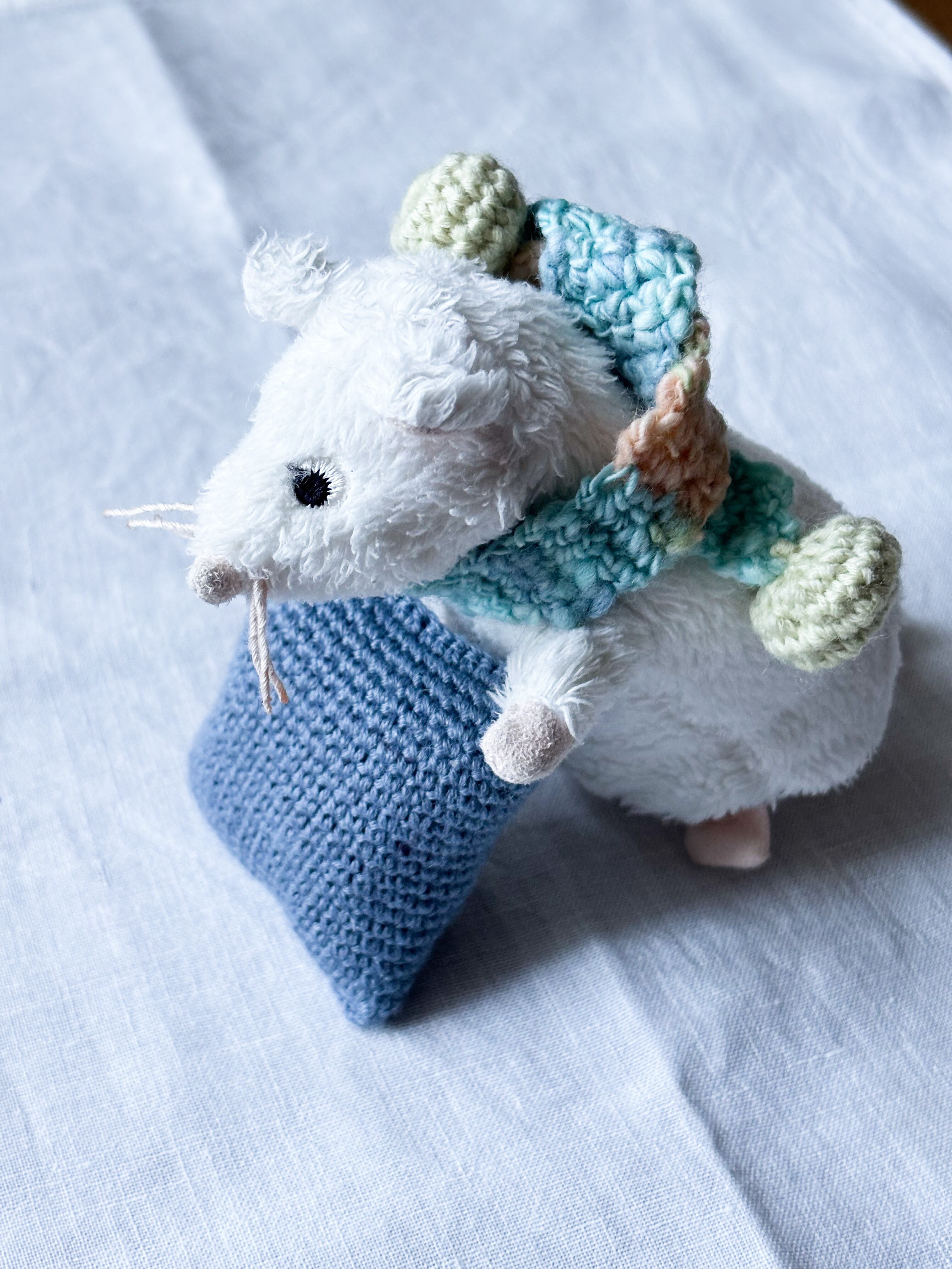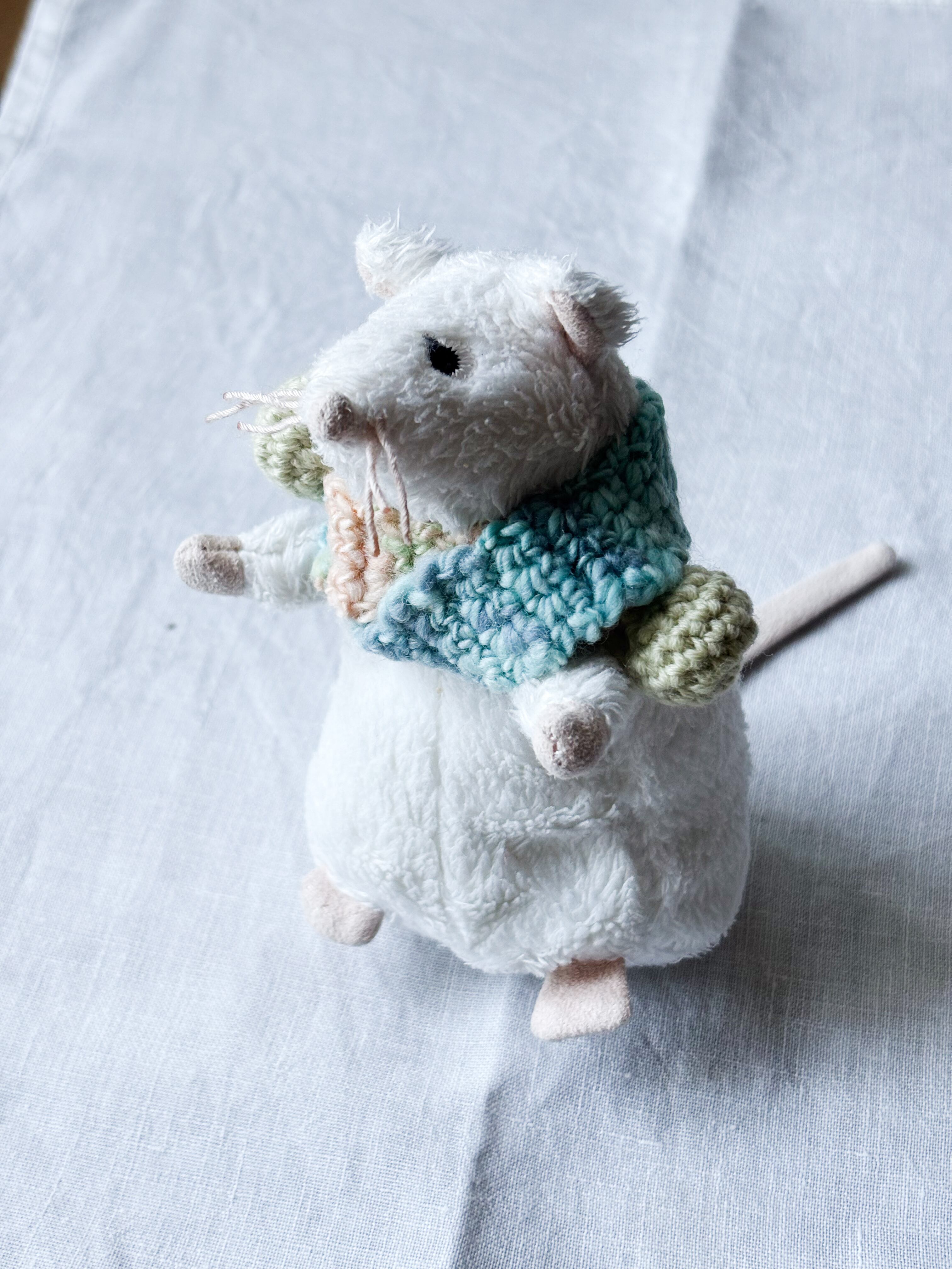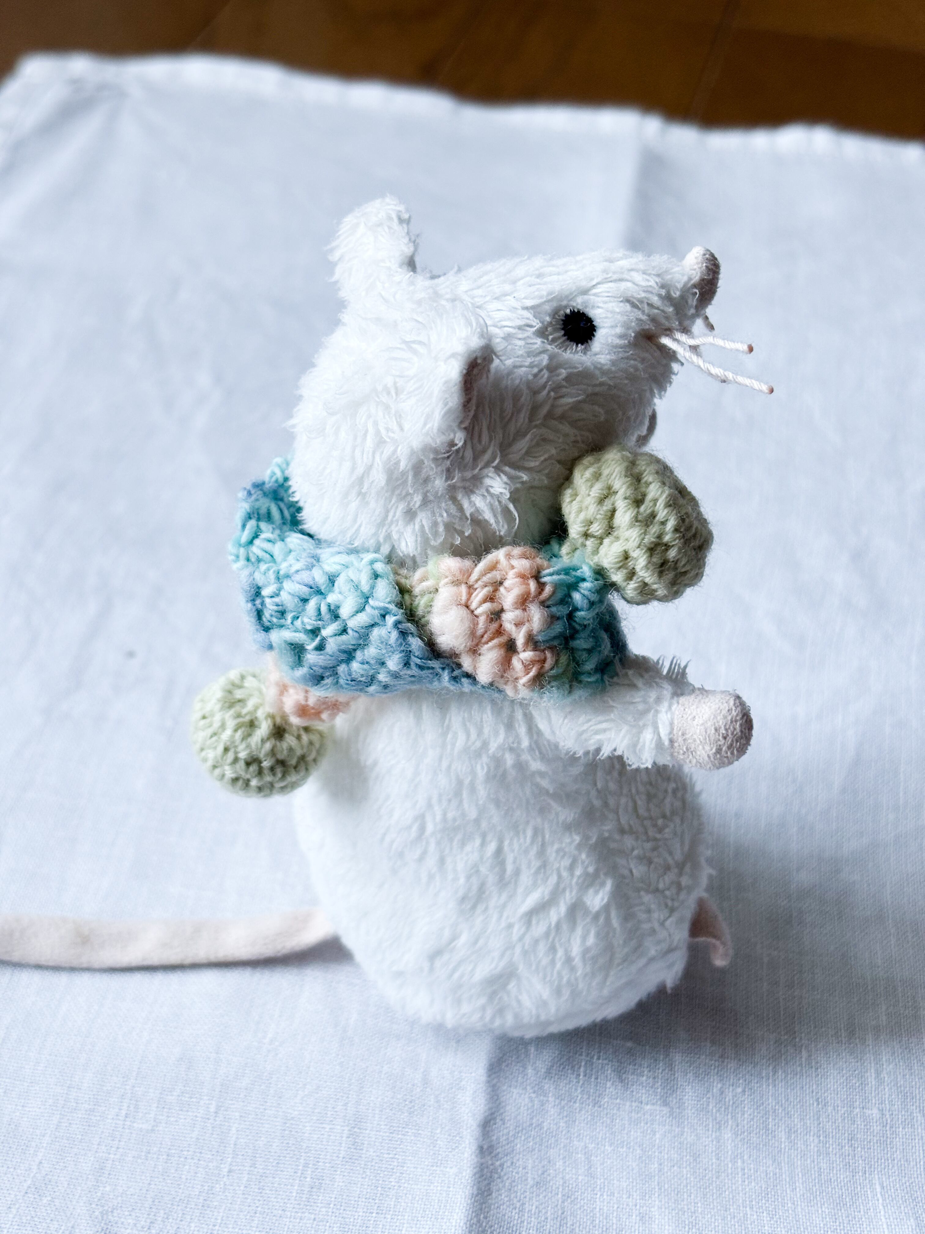 オリジナルで糸を作っている作家さんから購入したふわふわな糸で編んだ、ぬいぐるみさんのためのマフラーです。