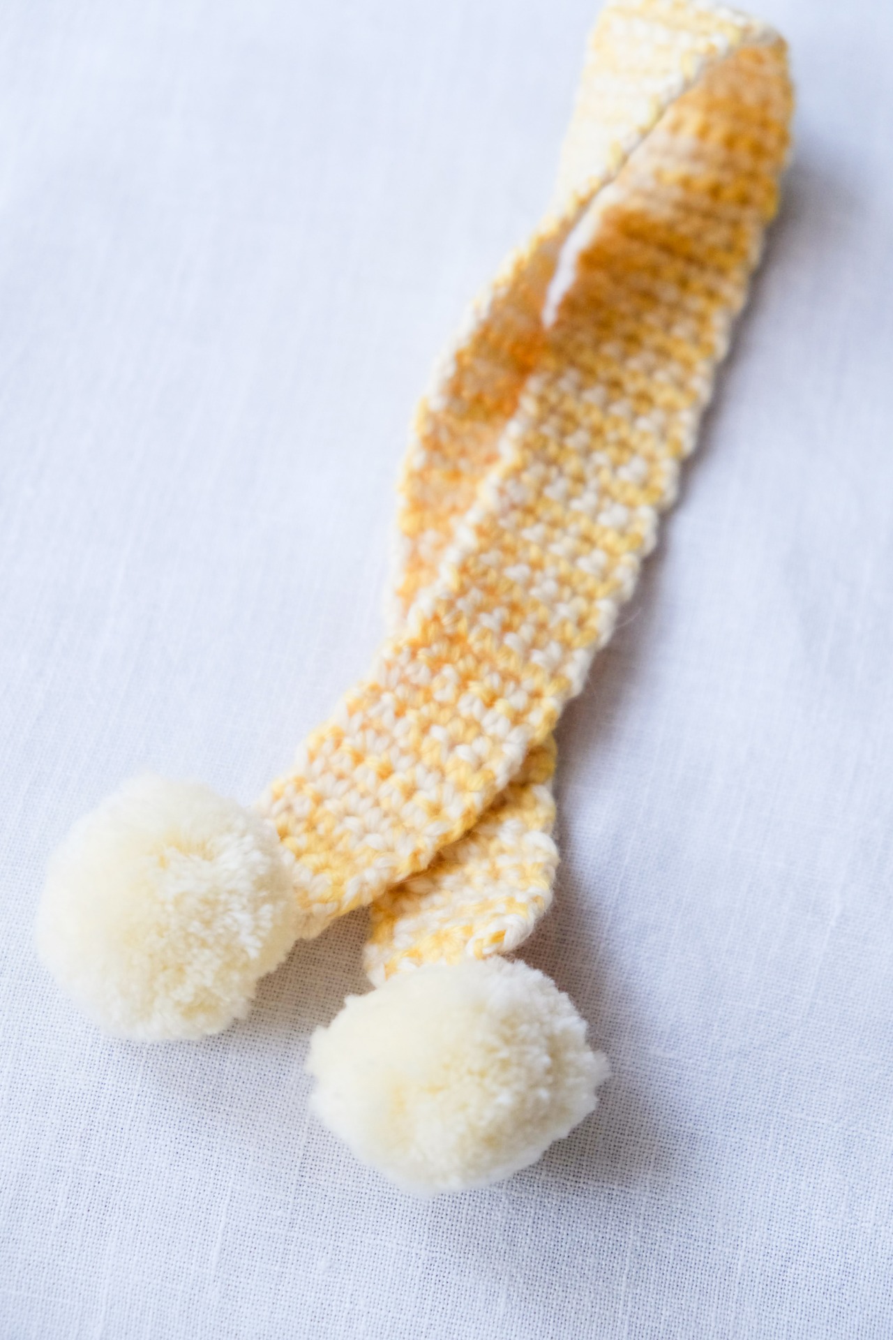 2色の黄色の糸をミックスして編んだ優しい雰囲気のポンポン付マフラーです。