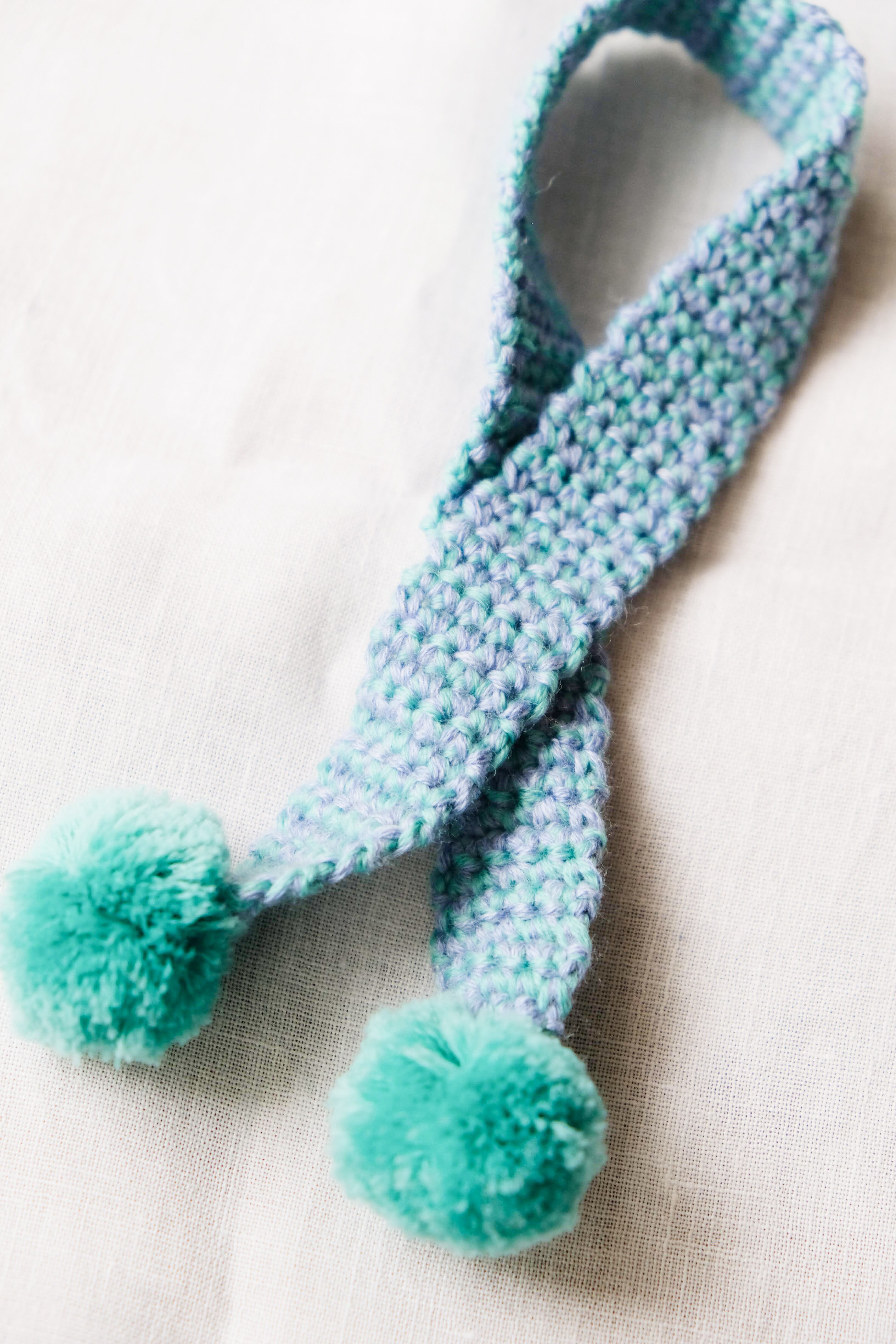 青と紫、2色の糸をミックスして編んだポンポン付のマフラーです。NEZUさんは空を見るのが好きなので、そこから思いついたカラーです。